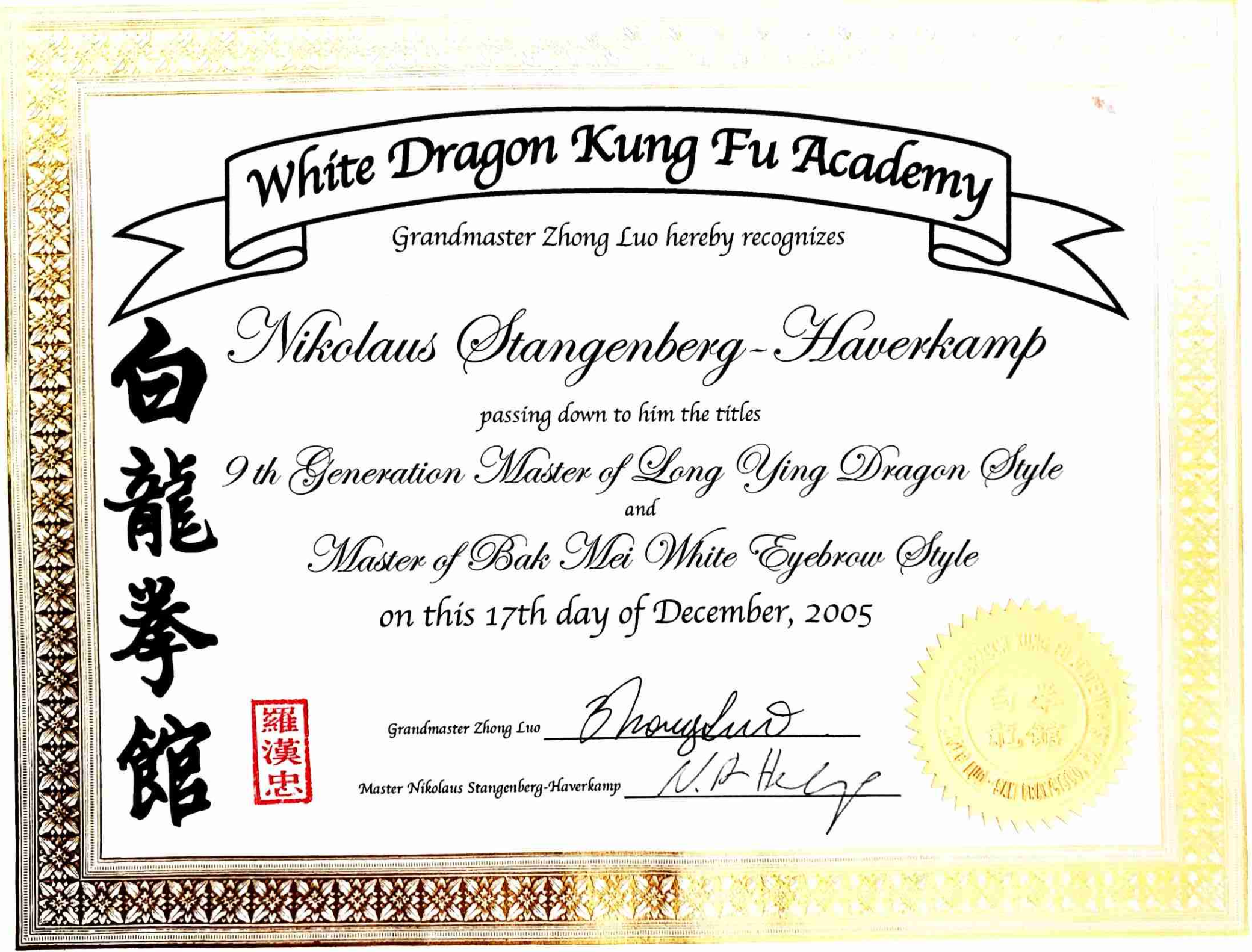 - Master Zhong Lao – White Eyebrow (Bak Mei) and Dragon (Long Ying) – Master Certificate
